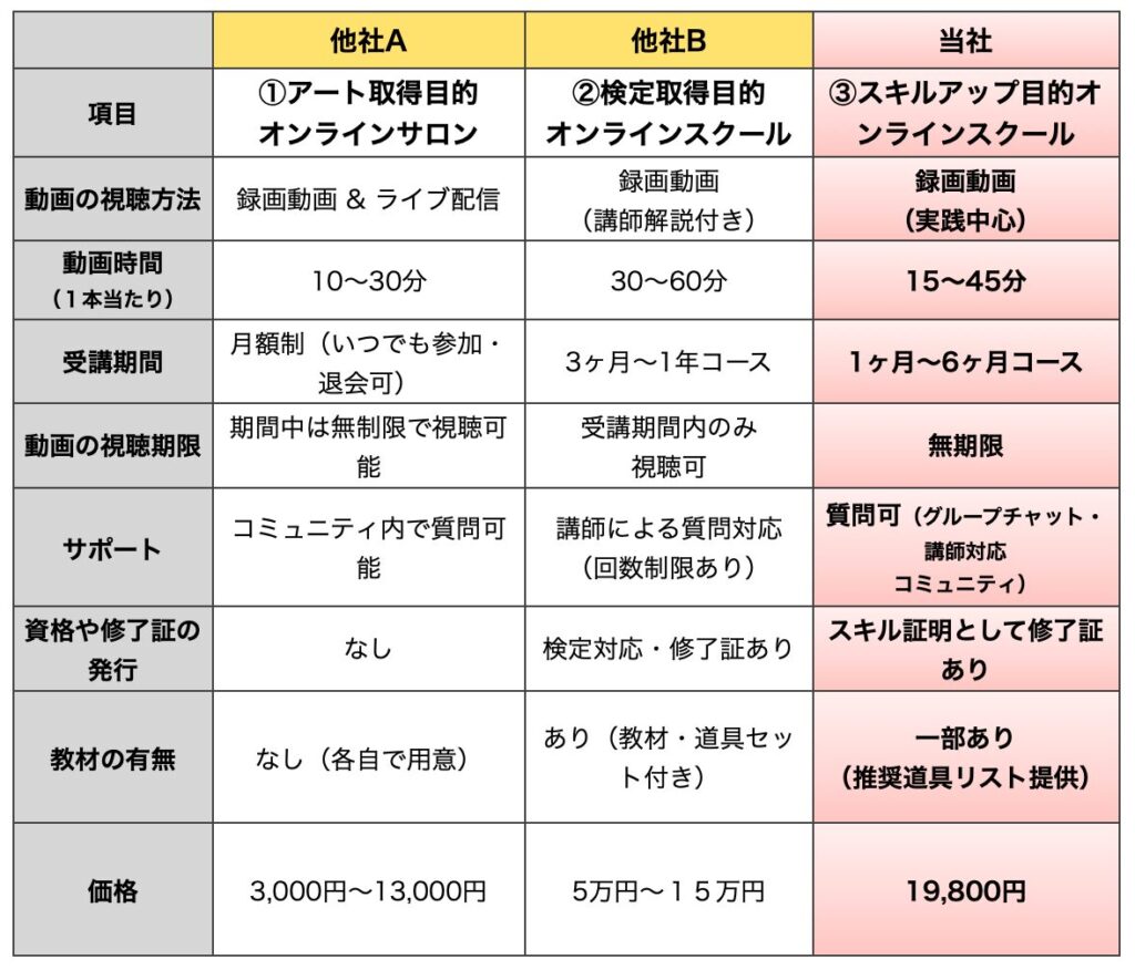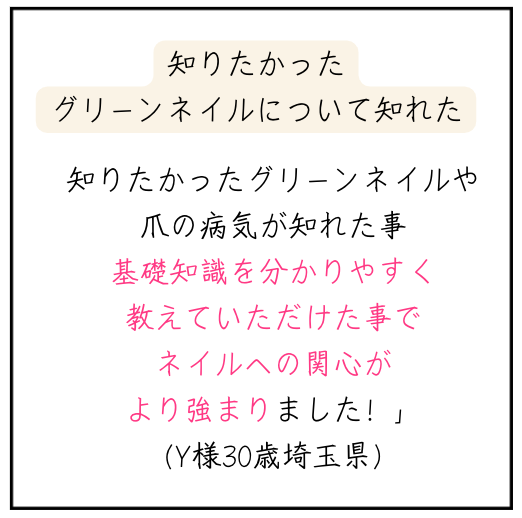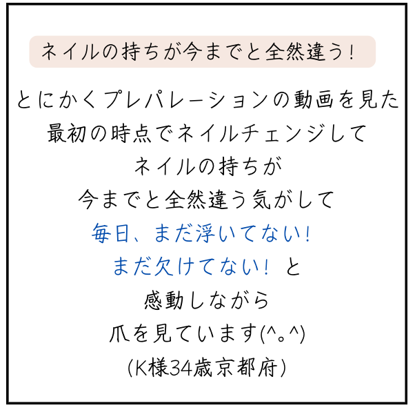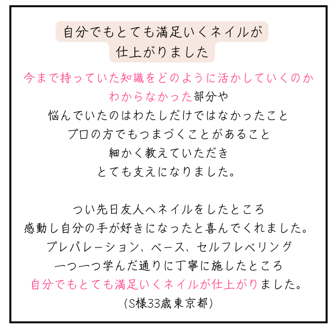 今回は多くの方に手の届きやすい価格にするため上級コースの「セルフネイルプロ養成講座」に付いているサポートを外しました。サポートがなくて不安な方もいるかもしれませんが、サポートがなくてもほとんどの参加者が上達しているのでご安心ください。