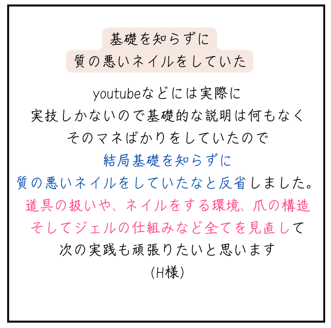 サロンのようなネイルへの解決策は、基礎知識をベースにネイルサロン(現場)で働き先輩にチェックしてもらうことだったんです。